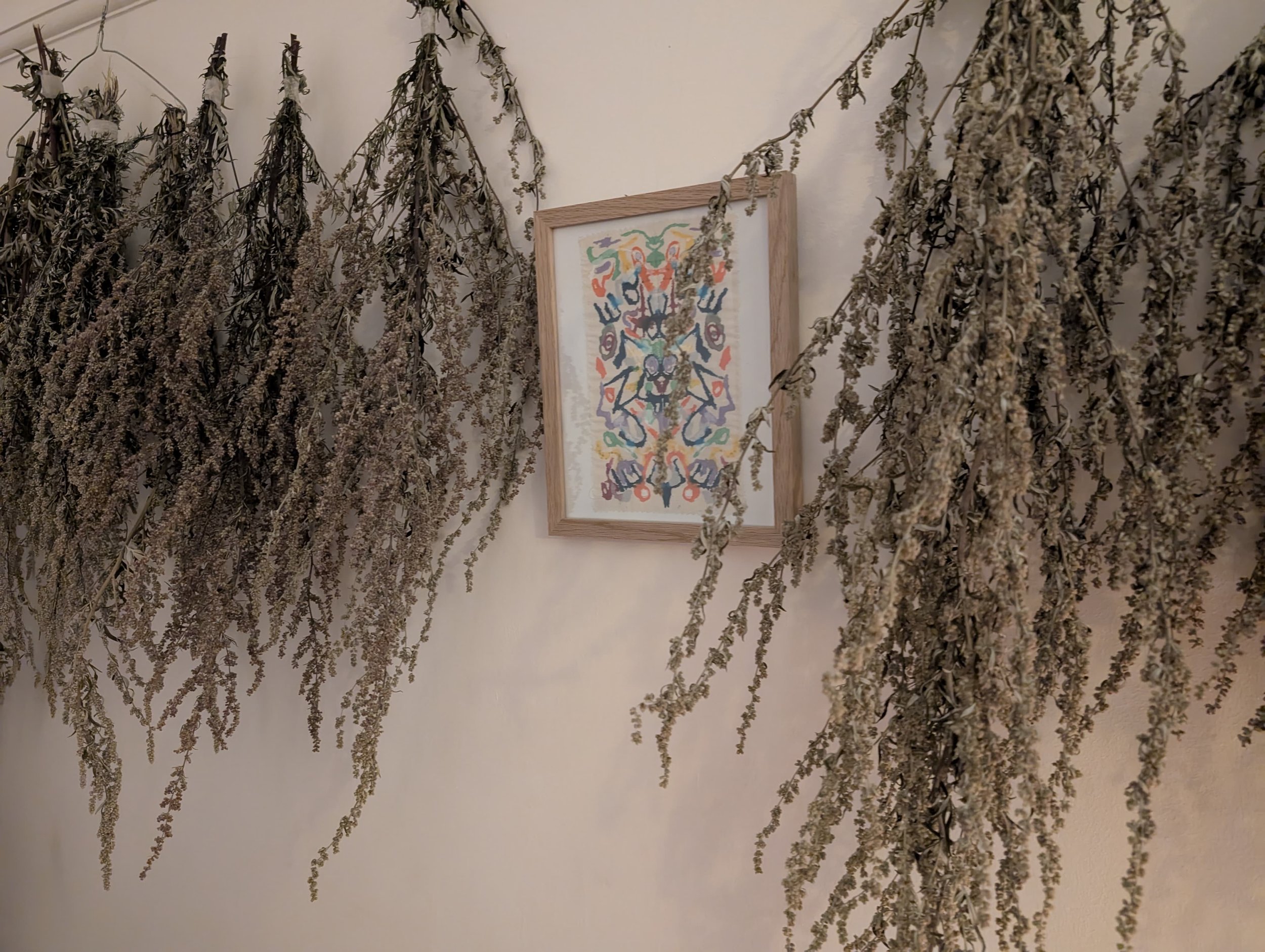 A talisman hangs on a wall, partially obscured by bunches of dried herbs which hang either side of the wooden frame. The talisman is made up of words, each written in a different colour.